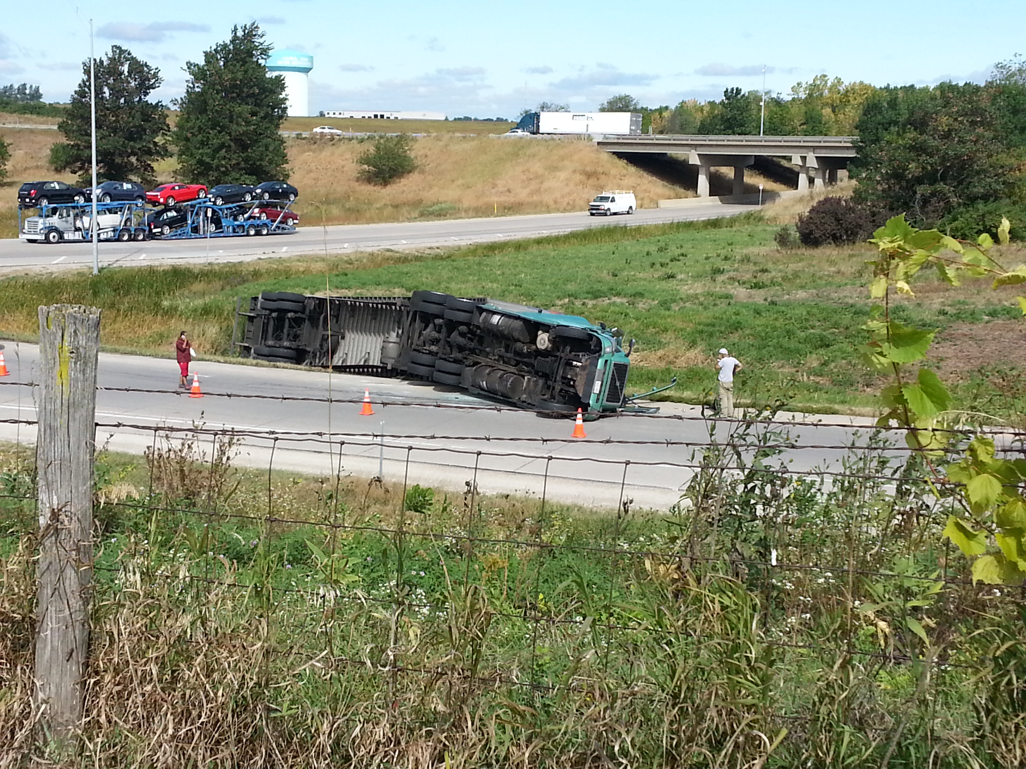 No…we didn’t come to an opening in the corn and see this. I took these pictures last week of a semi full of tomatoes who took the corner way, way, way too fast and ended up on it’s side. I’m always fascinated to look at cars and trucks on their top or side…Mostly because it is unusual to see the underneath of a vehicle and two because I’m just curious about everything.