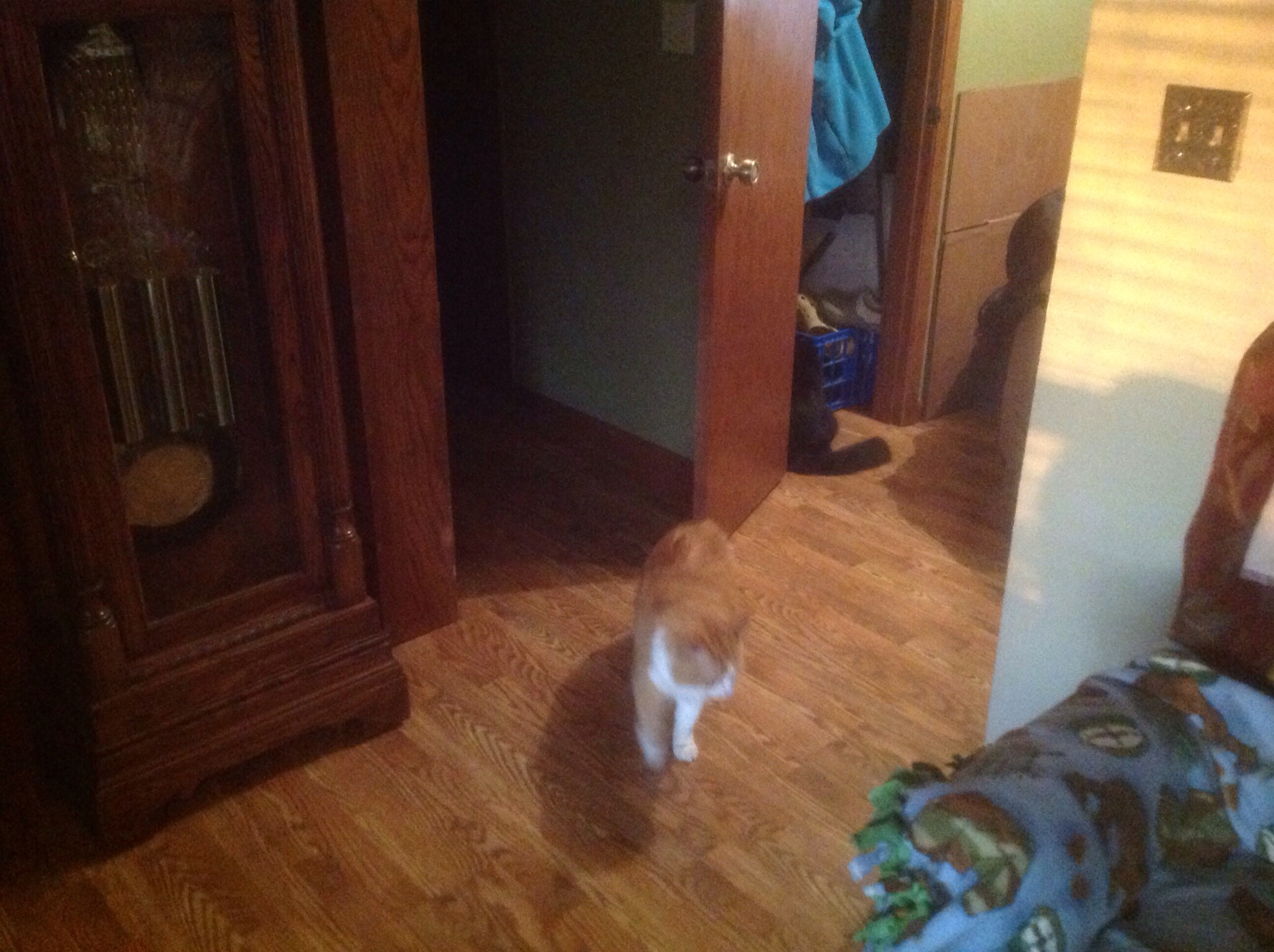Apparently while we were sleeping, the babies found a mouse and brought it upstairs. As I have mentioned before, they tend to play with the mice…they are NOT killers…they leave that to their canine sister, Frannie…crunch crunch crunch or to him…bam am bam. they initially lost it under the fridge….. but before I left for work….