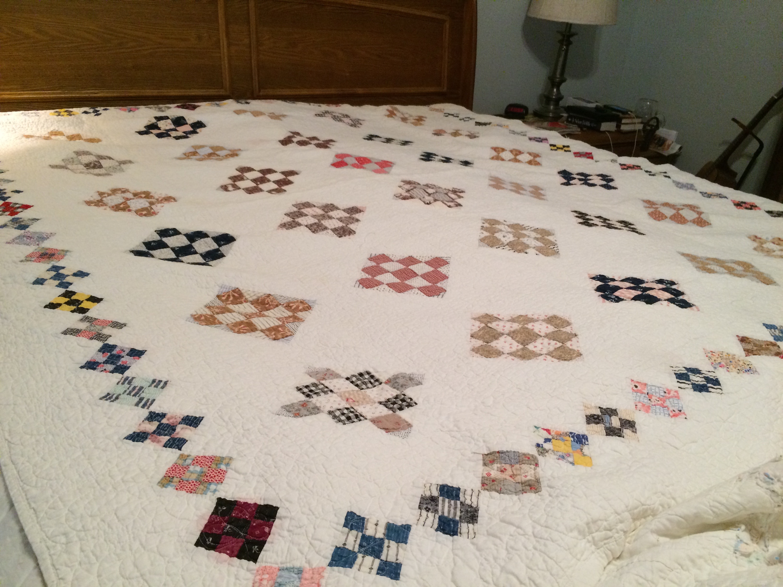 We removed a cabinet (that I got with gold bond stamps in the 70’s) from the guest bedroom last night and I had to unload my wonderful collection of family memorabilia – namely old quilts. Every time I see these quilts, I re-aquaint myself with the quilts and the notes my mother left on them so I know what they are and who made them. I have never used one of them because I didn’t want to wear them out or damage them because, after all, they are family history. Today, I changed my way of thinking.