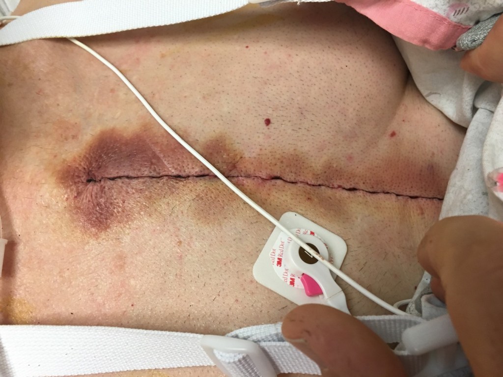 2. That’s a nice clean cut. The scar should be minimal. Are you going to treat him with your famous scar oil? I’m thinking he won’t need it. Is he allowed to sit up yet? That might help the back thing. Some Blu Emu might help too.