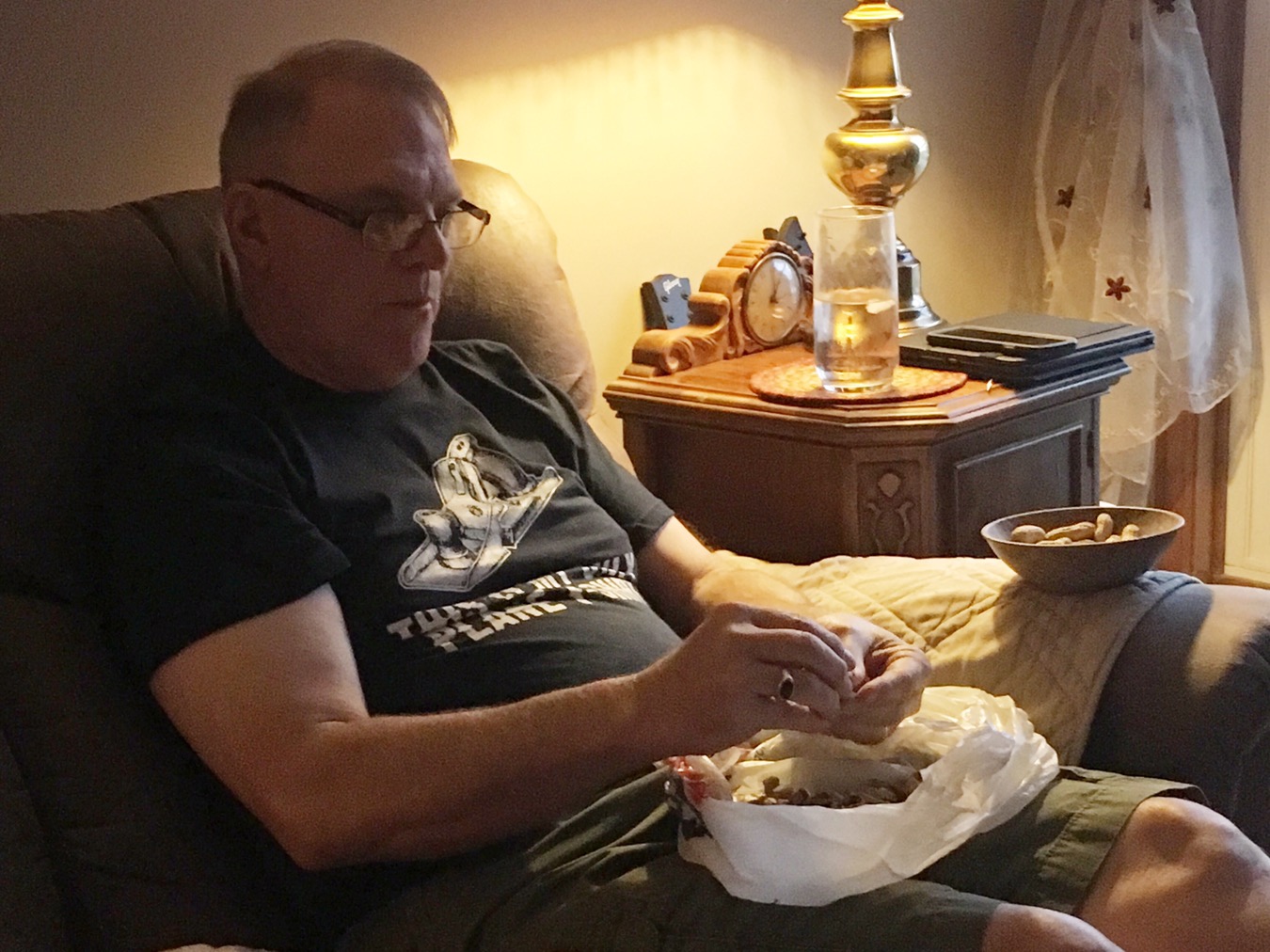 Every night he sits down with his bowl of peanuts and a bag for the shells.  I totally expect to look out the window and see critters looking in at him called by the noise of shelling peanuts!!  But darn if he isn’t cute!