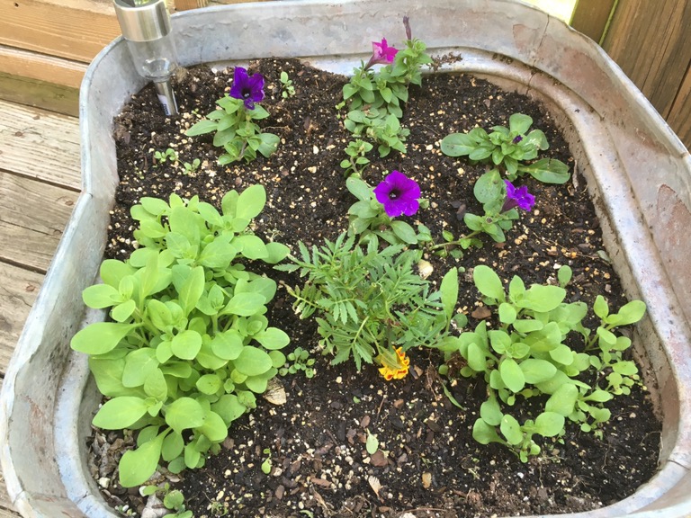 The petunias in the bottom right and left corners came back from last year, I thinned half of them out and the bottom picture just the one on the lower left corner. This is such a sweet surprise… I’ll be anxious to see how well they do this year