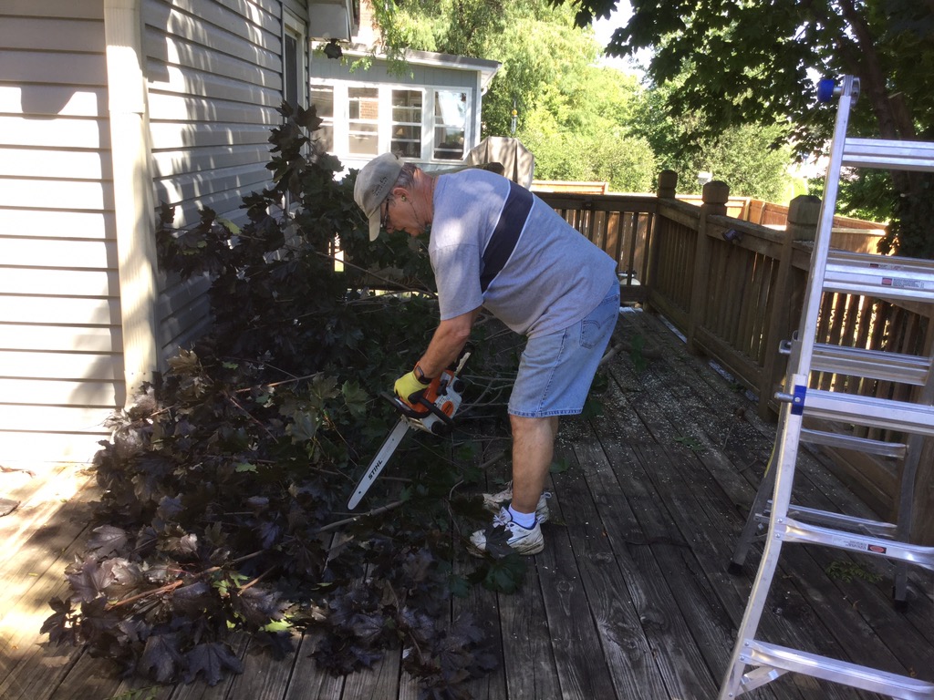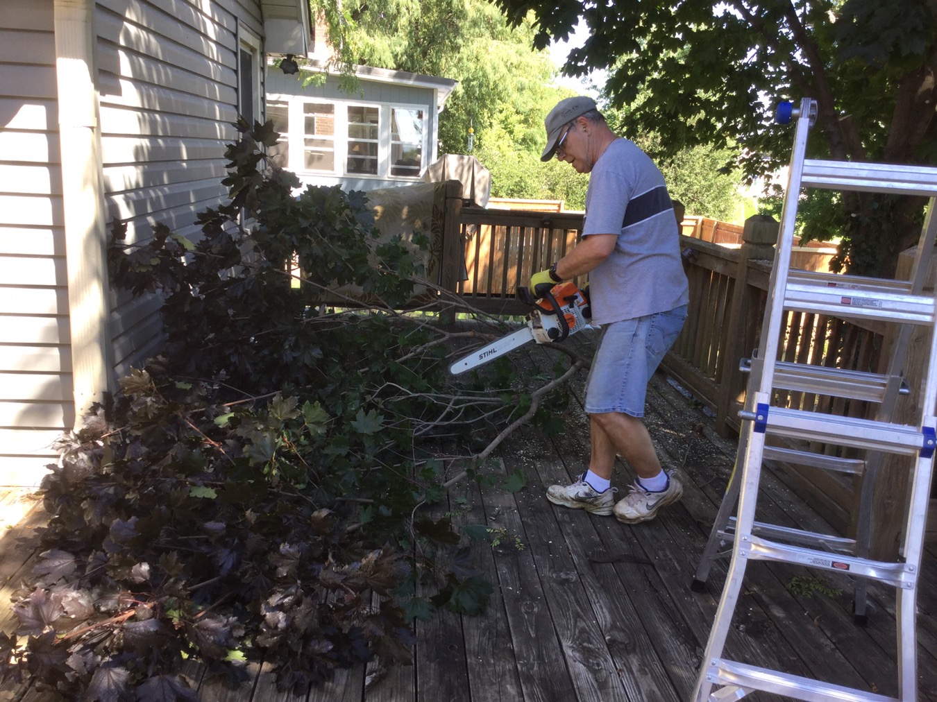 This morning, we cleaned up some limbs on trees in our back yard.  I take no credit…he did all of the work but I offered my valuable opinion.  Several limbs were hanging down over our deck and out in the yard, several were just gasping for relief – close enough to the ground to become a problem.