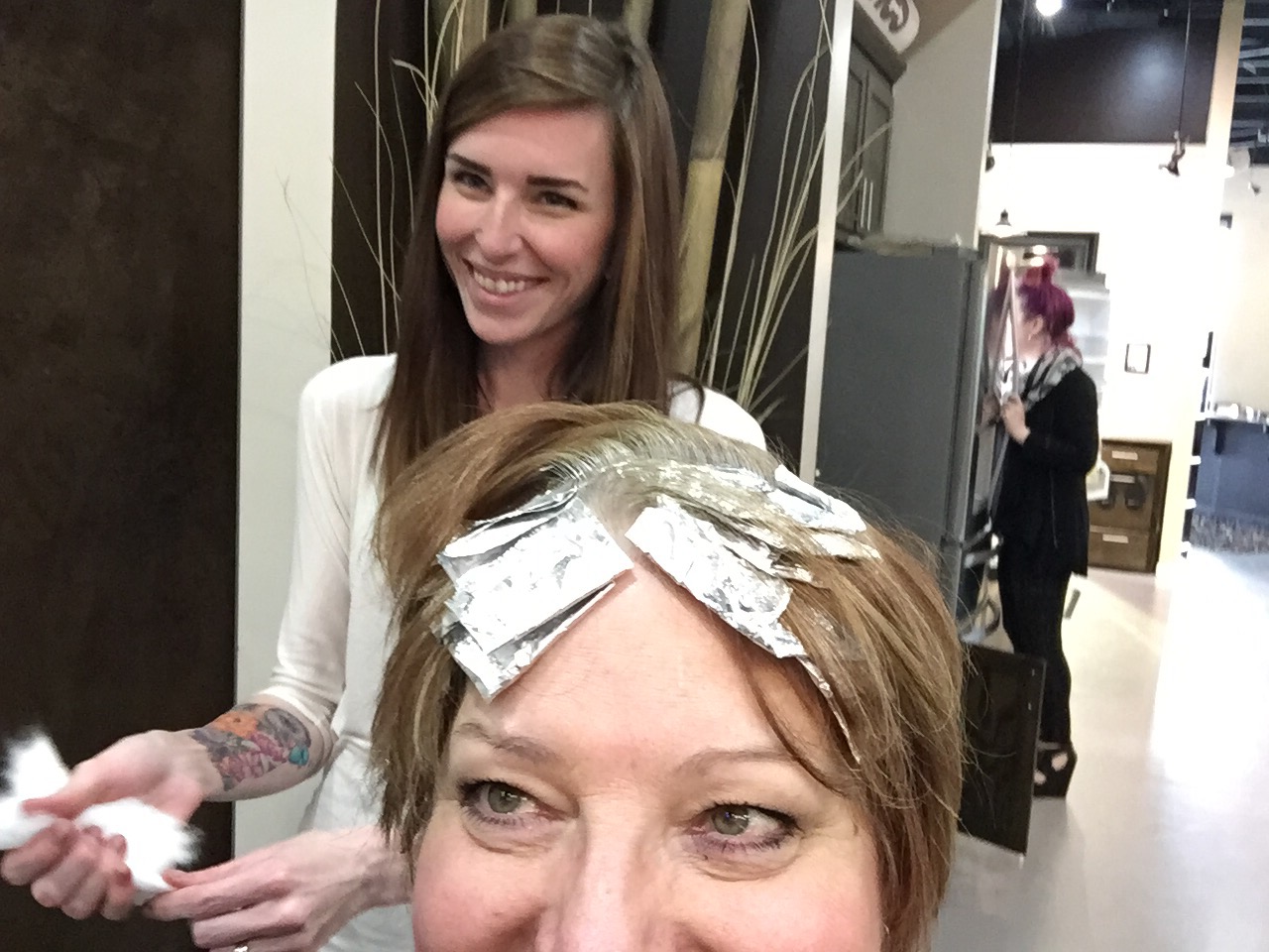 I spent a few hours this afternoon at the salon. I’ve decided it is time to let nature take control and let my color grow out to my natural color…which at this point is white. I’m to the point that there is so much white that after 4 weeks, I look like a skunk. Nikki, the color goddess is up for anything and I’m sure once all of the color is gone, she will come up with some awesome unnatural color highlights.