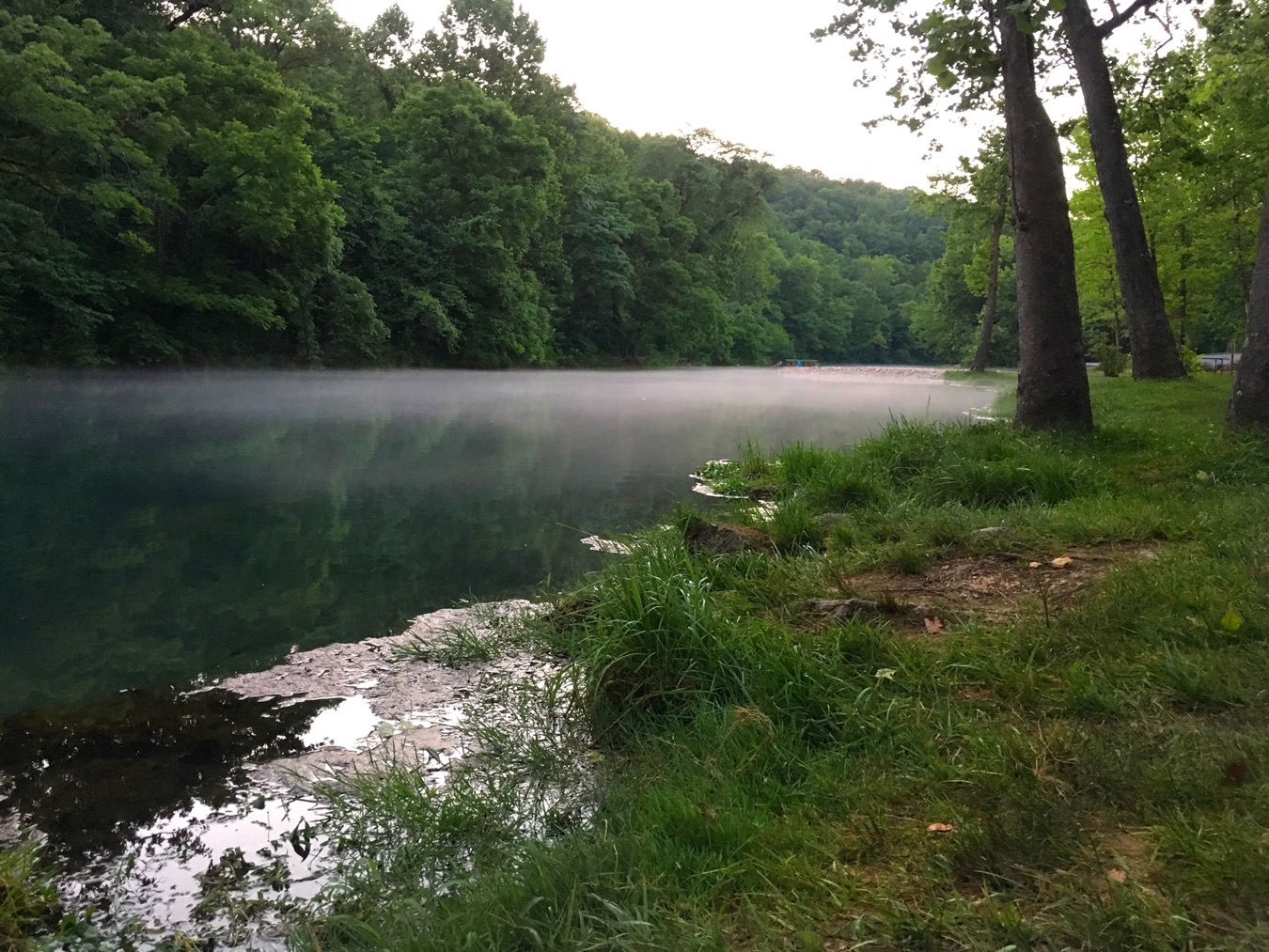 When we got back to Bennett Spring tonight, we took a walk along the stream closest to the actual spring. As frequently happens at dusk after warm, humid days the fog hangs over the stream. We’ve experienced the fog so thick that anglers were totally enveloped…
