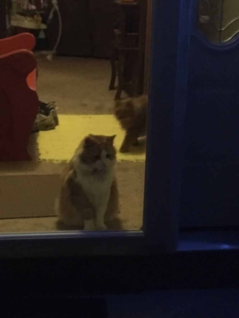 Waiting to be knocked over and trampled by Frannie just as excited to get in the house as she was out.