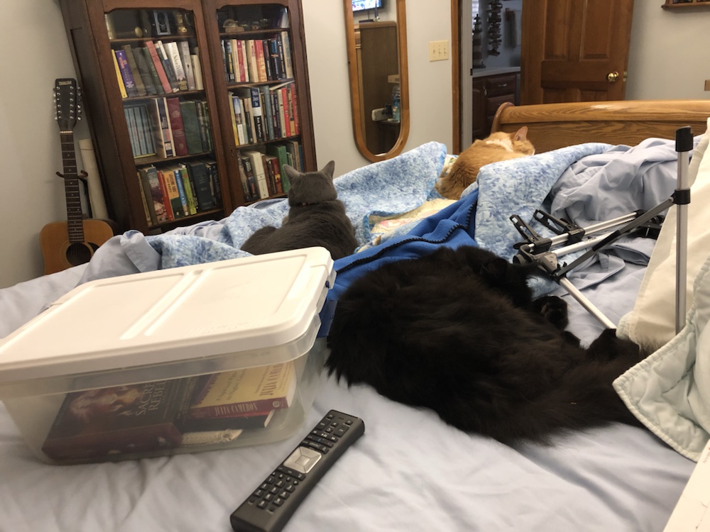 I kept smelling something…it would come and go…so this morning, I leaned over and smelled the cats…each one separately…I smelled my shirt, I smelled the bed linens and the pillows, I reached down and smelled that foot contraption…then I opened the lid and smelled that box. That’s it. I smelled every book, every journal…every oracle card box…everything….and then everything was out of that box….except a rolled up paper towel…it was rolled up so I didn’t get the dripped tuna salad on anything Yesterday and making it nearly invisible at the bottom of the box. I mentally apologized to the cats because they don’t listen to me anyway but I just felt bad that I questioned their hygiene since they work so hard at keeping clean.