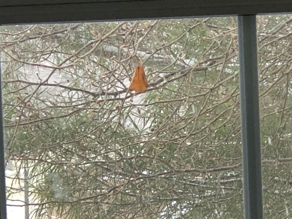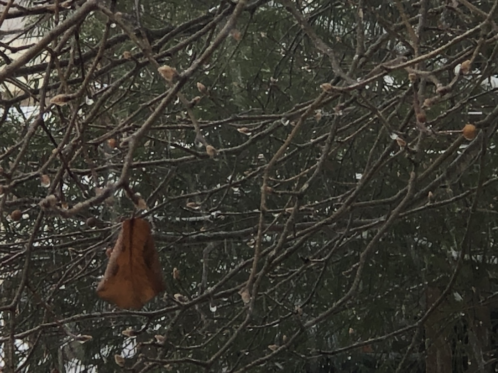 Hanging at eye level out my kitchen window is this shriveled leaf still attached to its branch. It has survived several windy autumn days, thunderstorms, gentle rain, sleet and a significant snow storm and still remains today while, again, snow flakes fall all around.