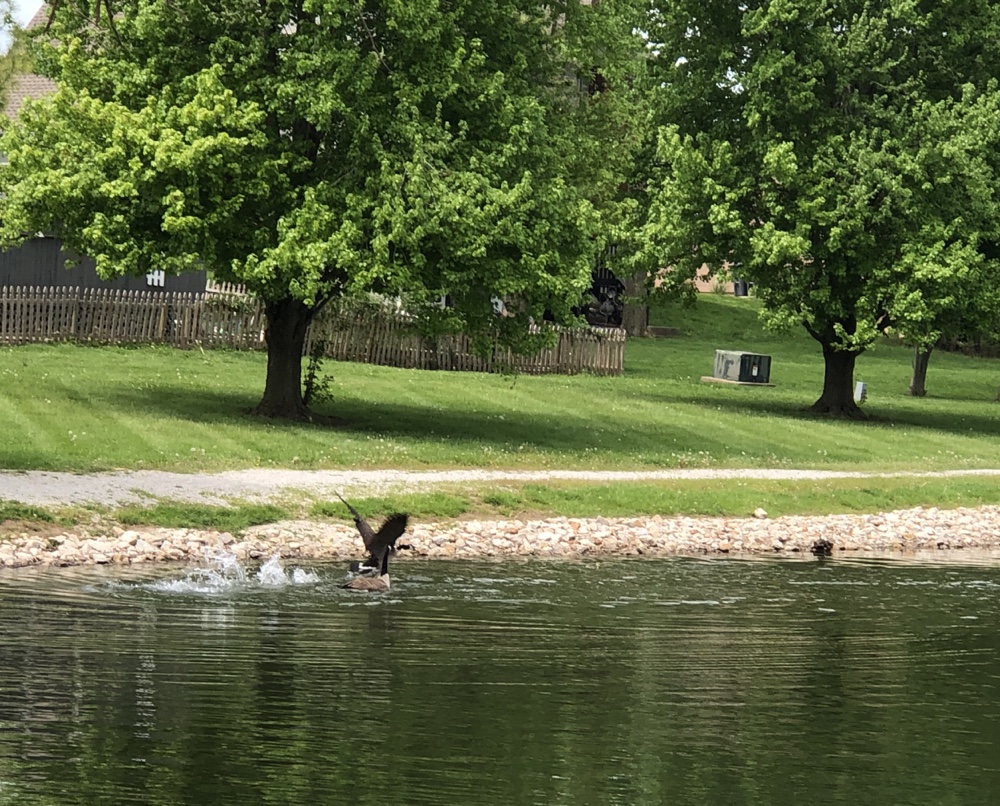They are very protective of Jr and actually hissed and started charging me on the trail. I got far enough away to just stop and watch “our geese” walk down to the pond to make their acquaintance….Which caused very loud dispute, flapping and all out dislike. I tell you…”our geese” were just trying to be welcoming and visit the little gosling. Mom and dad were very protective of the baby and would accept no intrusion.
