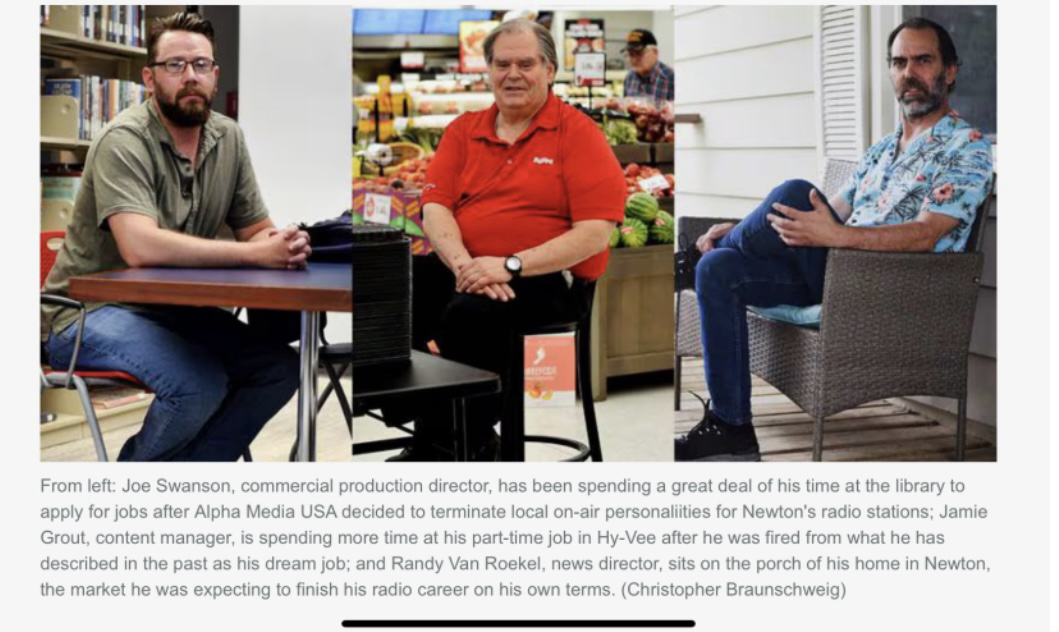 This story is not just a Newton, Iowa loss but a loss to a way of being…small towns who rely on their radio stations for local news, weather and sports… the important hometown play by play broadcasts for the high school teams. Small town radio stations being bought up by mega media corporations stifles the opportunity for many who dream of their voice being heard in cars, homes and earbuds….and it’s a loss to the way we live our lives giving up to large corporations while pushing out Americana!